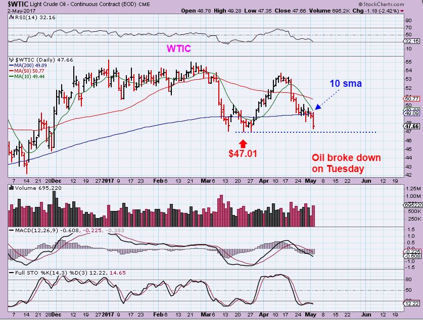 WTIC –  Oil broke down Tuesday, but it hasn’t broken the March lows yet. If it does, the ICL is still ahead. We have the oil inventory report that comes out on Wednesday mornings.  We do see divergence on the MACD too.