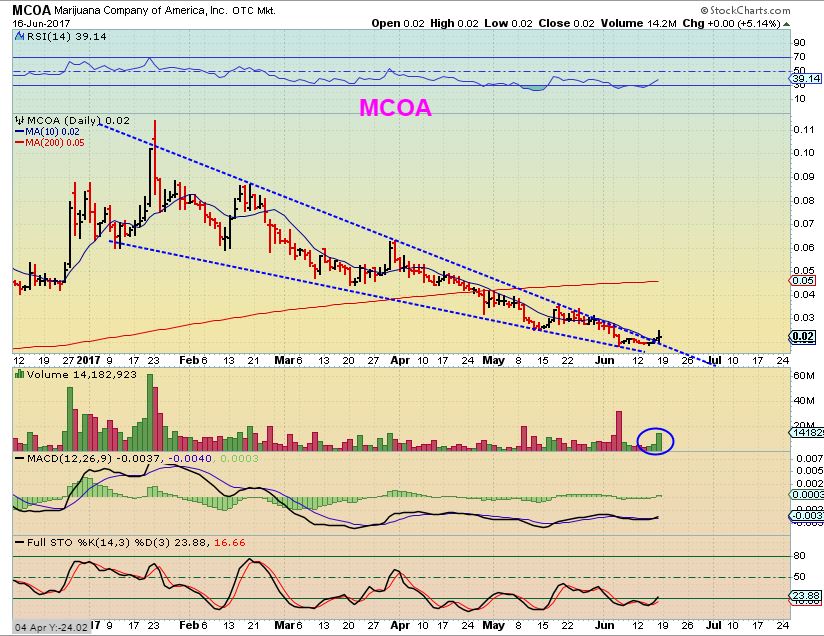 MCOA – This one is a 2 cent stock, and it was only up 5% Friday, but the fact that it is moving out of a wedge base and increased in volume could be viewed as a positive.   It CAN just continue to base out and double bottom too, but again, if it runs to the 200sma, it is a 100% move.   I am basically posting this to show that an entire sector is reacting without news and this sector may be bottoming. a 2 cent stock is obviously higher risk. A drop to 1 cent is a BIG loss.