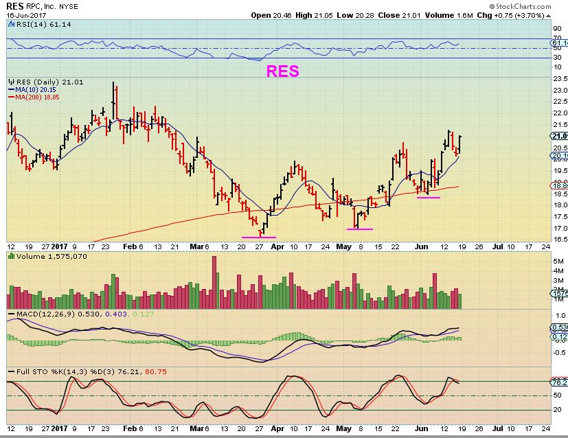 RES – It is now easy to see that RES has a series of higher lows and support at the 50sma & 200sma. This is becoming a bullish chart and a leader out of recent lows in Energy.