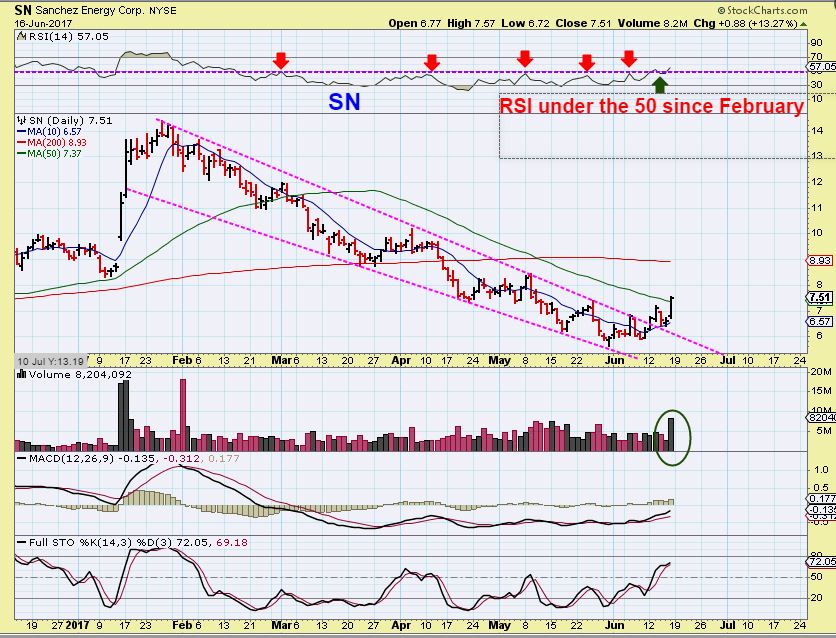 SN – Last week on June 13th I pointed out that I thought SN was breaking out above the 34sma  ( I used the 30 here). The lows were under $6 and it was now at $7.12.