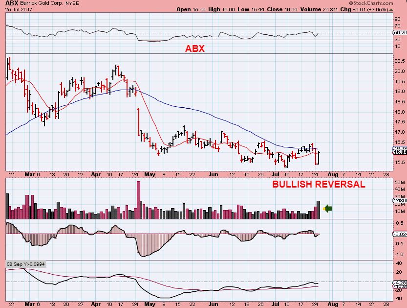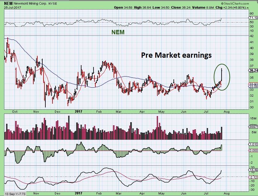 ABX quickly reversed that ugly down day yesterday, and this is usually a bullish occurrence. SO the day before the FOMC meeting, we see NEM breaking out higher on earnings, ABX turns bullish, and GG is still above the 50sma. That is encouraging.