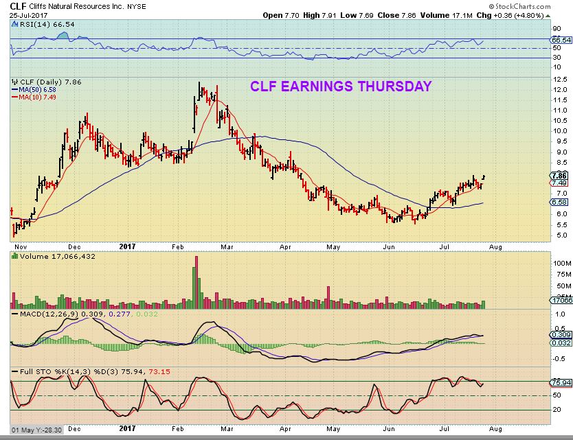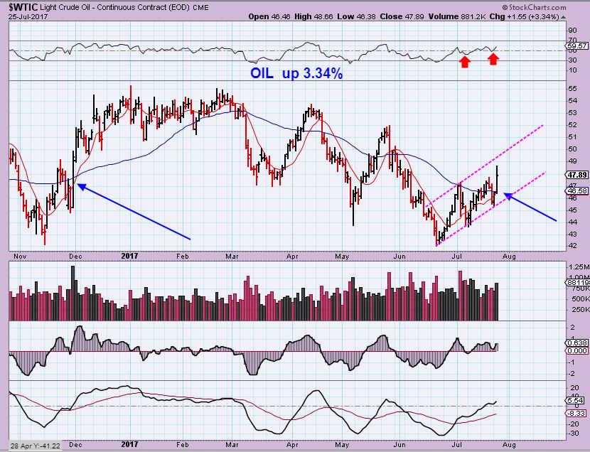 WTIC – Tuesday we saw Oil jump up over 3% , regaining that 50sma easily. This chart is Bullish and in the weekend report I will mention just how bullish this could get. For now I was a bit concerned about Oil/Energy stocks struggling at the 50sma too ( CLE, OIH) .