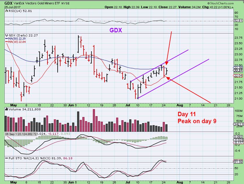 In the report today under GDX , I mentioned that this CAN continue higher for even day 20 or so, and then drop into a DCL. That is what I will be looking for going forward….