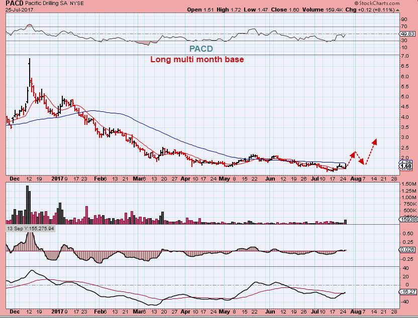 PACD – A nice long base and a 9% pop on Tuesday, PACD is repeatedly bouncing off of the 50sma. This may do quite well when it finally breaks free. AT $1.50 , a run to $3 on this chart is a 100% move.