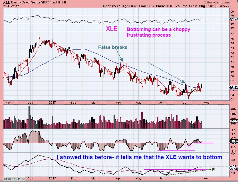 XLE on JULY 6th. This chart that I used with my special indicators was telling me that the lows were possibly being put in place, even as it dropped 2 sharp days in a row. PATIENCE was recommended, because bottoming can take time, become choppy, and frustrating. For example, to be safe, I wanted to see the XLE above the 50sma for starters. Please see the chart.