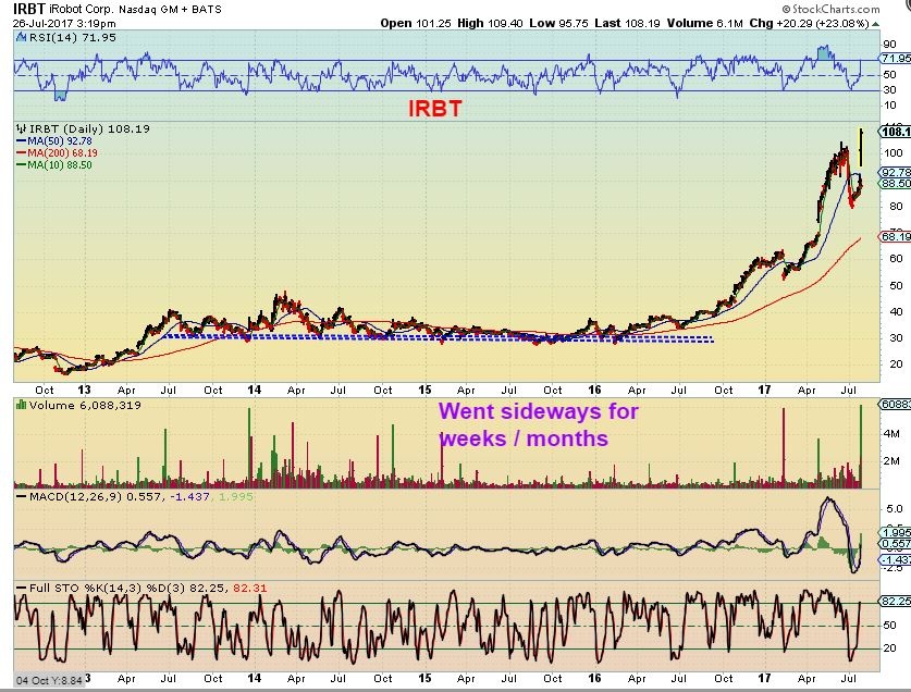 When I used to work doing sales for an Aerospace company, I visited IROBOT in Massachusetts and they had the coolest quality ‘stuff’. I KNEW that company would do very well, but then their stock was stuck at $30 for soooo long. It would have been very hard to ride this choppy sideways action.