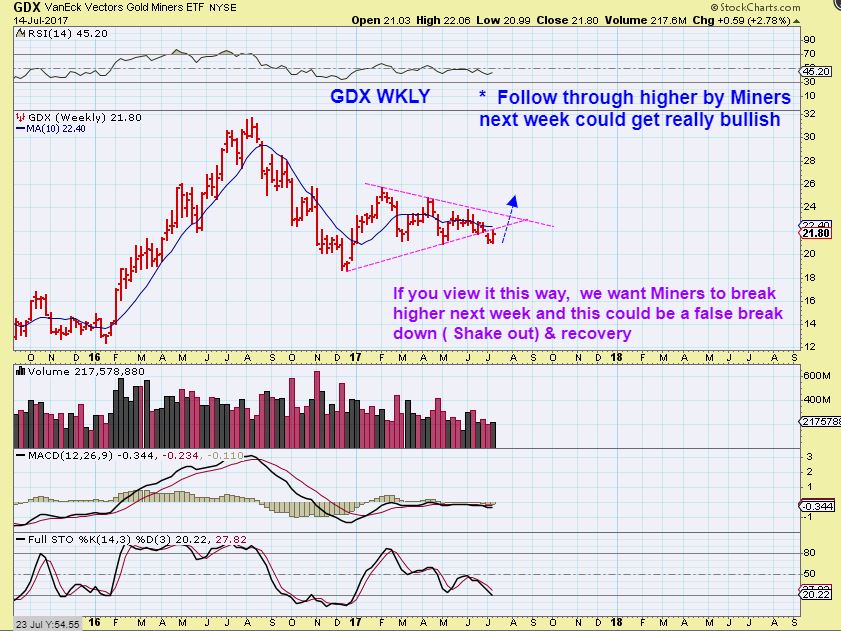 GDX WKLY – And this would be a more bearish view IF we did not get any follow through higher next week. It would be a break down & a back test, possibly about to be rejected below the 10 MA wkly. Follow through Higher next week would really be Bullish looking, so we will let the markets tell us what is going on in due time.