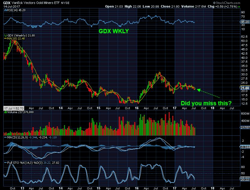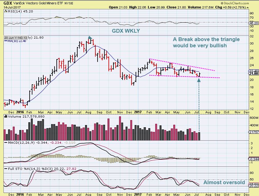GDX WEEKLY #1- This is a Big picture of a triangular consolidation. You can see that THE LOWS were near $12 in early 2016. At this point, this is a normal consolidation so far after a mountain of gains in 2016. If shorts start to cover, this could rally. ALSO PLEASE NOTICE THAT IF AN ICL WERE IN PLACE, NO ONE HAS ‘MISSED THE MOVE” in MINERS. The next run will be very profitable.