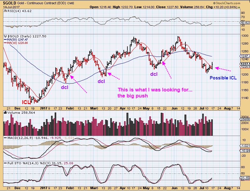 GOLD – On this July 12 chart, I was pointing out that even though it got rejected at the 10sma on day 3, we had seen that in the past, and then we got a burst higher over the 10sma. We also made new lows , so we have a failed daily cycle, something that I look for when looking for an ICL.