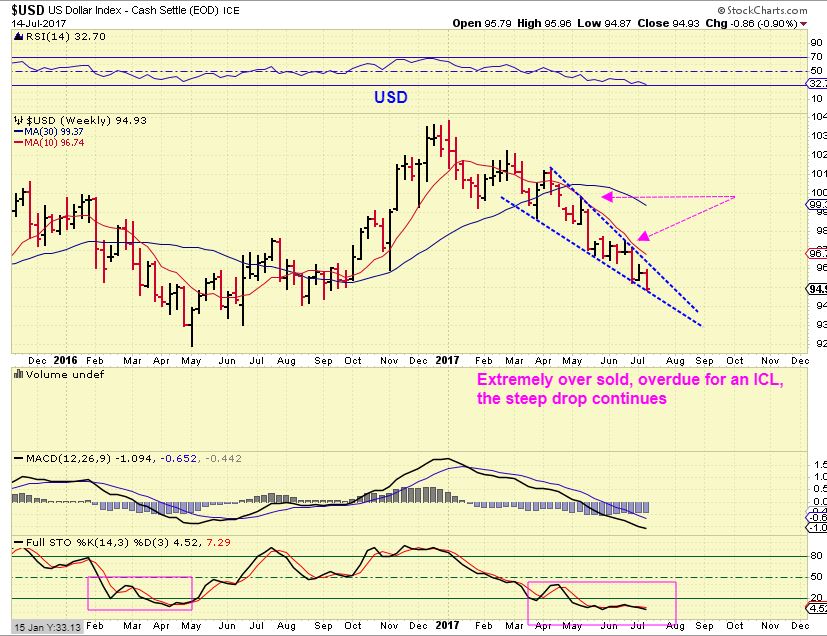 USD WKLY- The USD is overdue for a low and an ICL, but it just keeps breaking down. A break from this wedge would be short term bullish. That conflicts with Golds expectations for now. The USD & GILD are no longer tightly held in an inverse relationship, but it is common for Gold to drop when the USD strengthens. Right now, however, Gold looks bullish, as you will see.