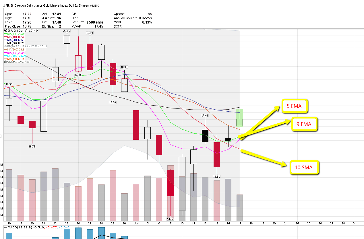 One more thing … the ANGLE of the MA’s is important to me, not just the value. Notice that the 5 EMA and 9 EMA are angled UP today on JNUG while its 10 day SMA is still angled down. To me, that indicates a clear change in the price trend and I consider that to be very bullish since JNUG is near its recent lows. The only problem with being a “trend follower” is that the trend can change quickly. So I hope this UP trend holds! 🙂