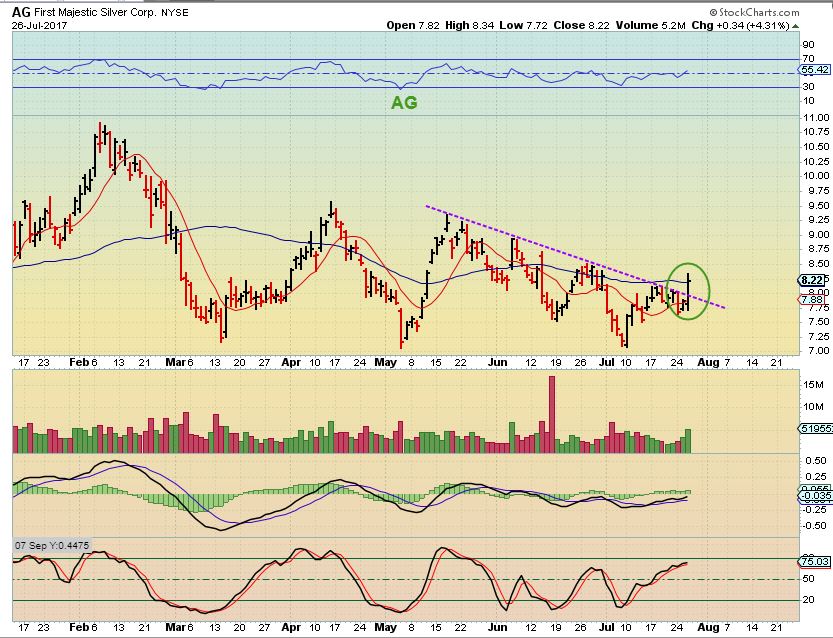 AG – Another inverse H&S  ( not drawn in) AG broke from a small down trend and is trying to close above the 50sma.