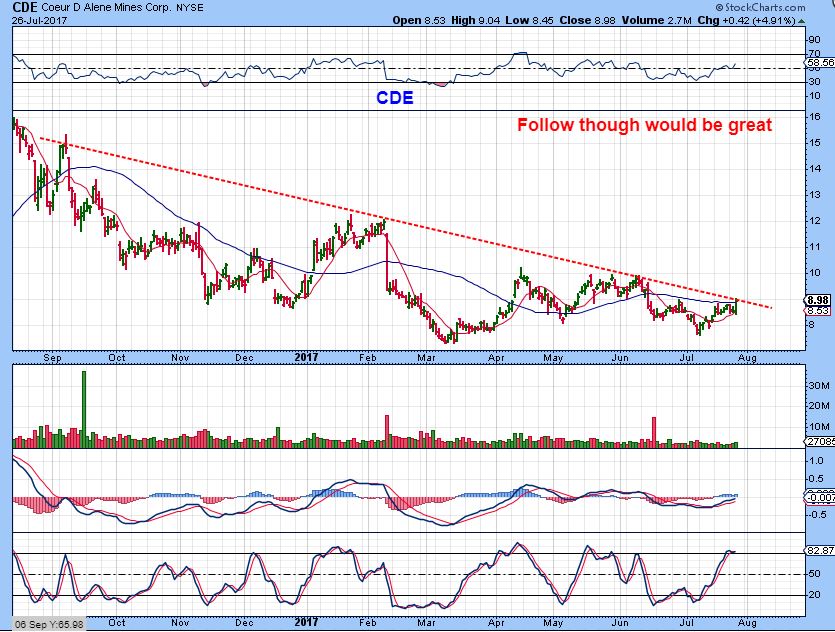 CDE – Follow through will break above the down trend line, and this could finally start climbing.