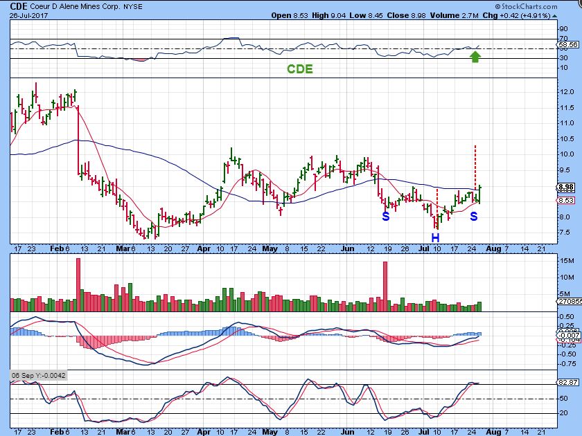 CDE–  CDE looks to be breaking above the 50sma and  I am noticing that many Miners recently formed an inverse H&S in this bottoming process. When Miners start running out of these consolidations and bases, they can move quickly.  March $7.25 to $10.25 was a weak run.