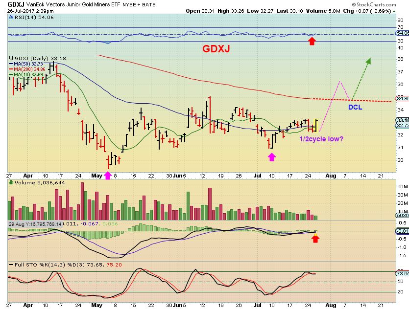 GDXJ –  I would view this recent mini pause as a 1/2 cycle low like this.  I would like to see a move higher to break above that 200sma, and then a higher low for the dcl.   The Dcl could happen with a break out and back test of the 200sma, especially if we now get some short covering.