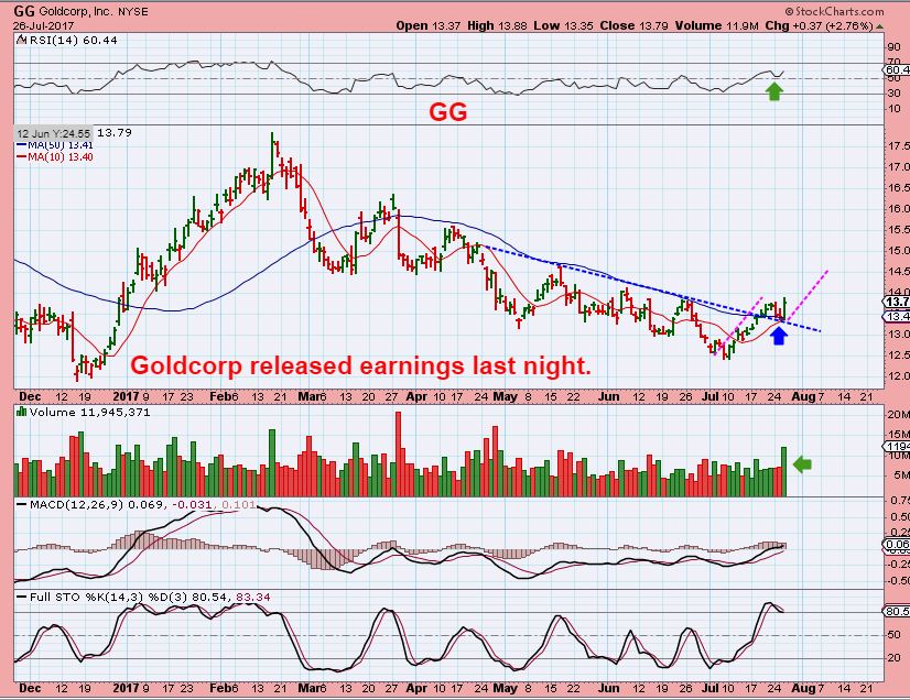 GG –  Goldcorp released earnings last night, and they were viewed as positive. Before that, GG back tested the 50sma and reversed higher.  That is the buy in the lesson that I posted a few days ago, with a stop under that 50sma.