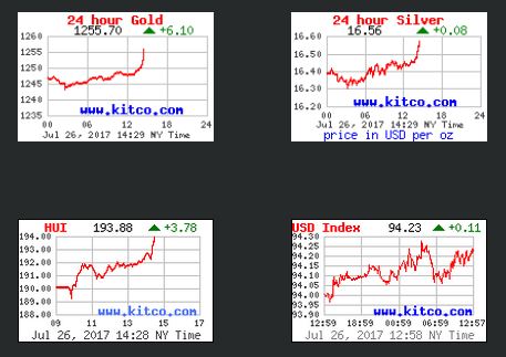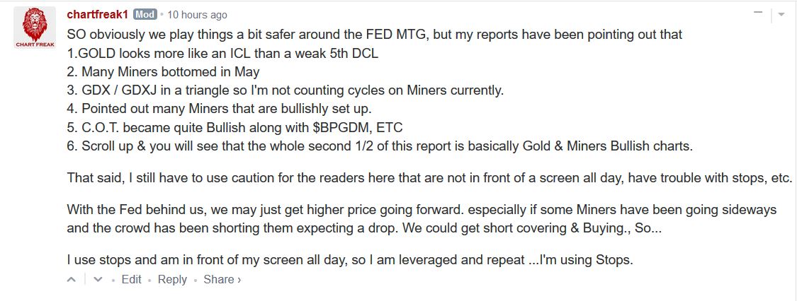 I expect/hope to see a drop in miners this morning as a buying opp. Typically after a big up day there will be a retrace of about half the move of the previous day. For example, see JNUG on July 10 and 11. The dip may not last long and typically reverses about 30-60 minutes into the trading day (if miners are in an UP trend). I have a buy order in at $17.64 to add to my JNUG today. Hope it hits. Good trading to all!