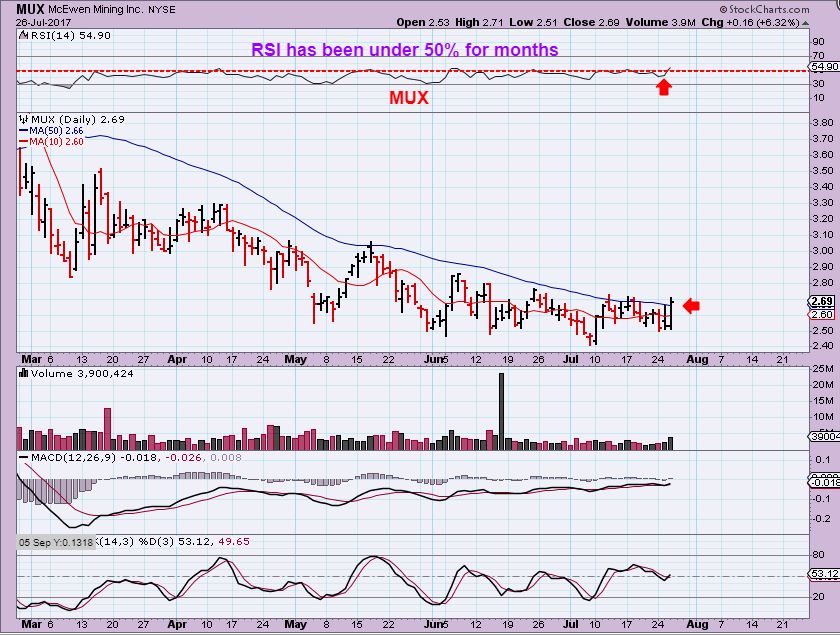 MUX – I pointed out MUX on July 18 as it broke from the downtrend and pushed against the 50sma. The lows were June 10th. This looked like it would eventually push above that 50sma and could eventually run back to the prior highs of $4.40. Last December, coming out of the ICL, MUX ran about 75% in 2 months.