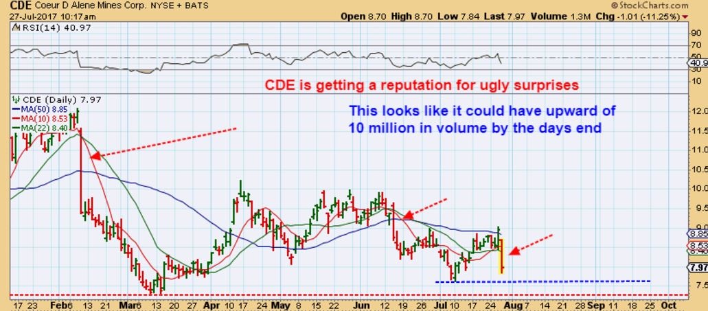 Cant be sure if buyers will step in or not. CDE sold off in a big way, but has recovered quite a bot.