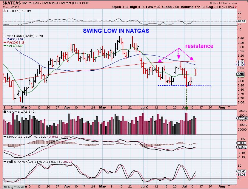 NATGAS -Inventories come out on Thursdays, and the NATGAS chart seems to have put in a slam down high volume low last week. We do have solid resistance above with a 50sma & 200sma cross under, so this needs monitoring.