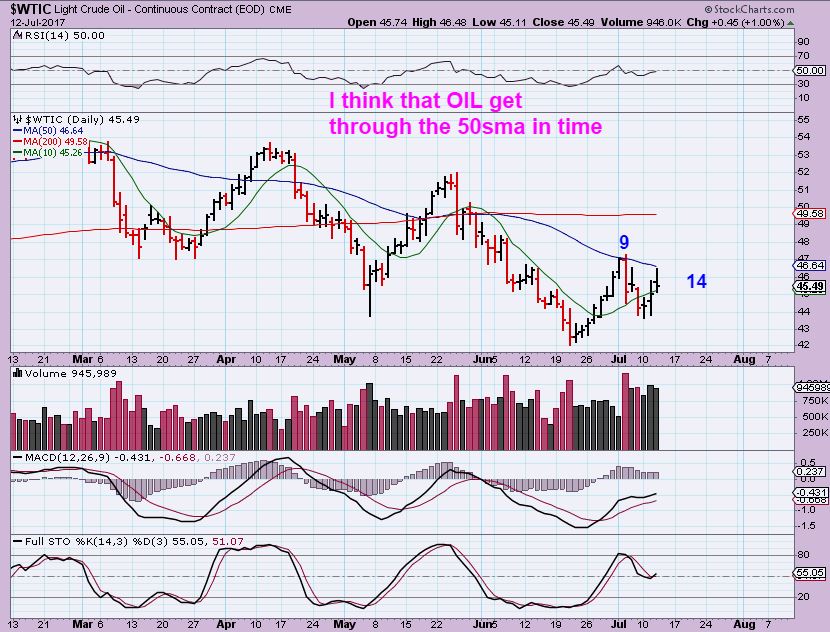 WTIC – Oil was stalled at the 50sma, but I am thinking that this stall will be temporary. It remains above the 10sma & the oil Inventory showed a drop and that ought to be bullish.