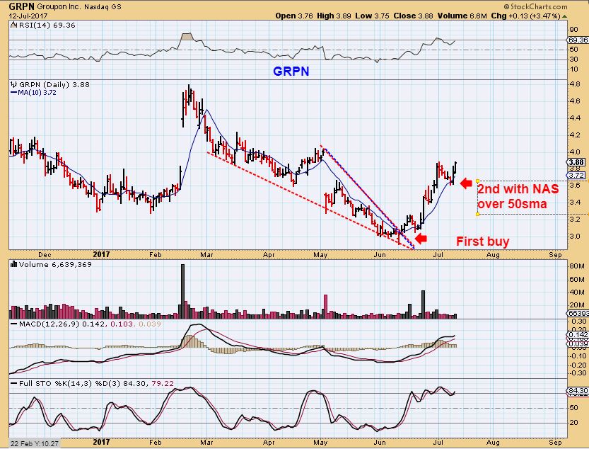 GRPN – This could be bought with a stop under the 10sma. In my personal day trading, I did a small trade on GRPN when it broke out from a wedge near $3.00. I then I watched it continue higher after selling a POP at $3.40 area. It has moved up quickly in a Month and the set up is acting correctly at this point. My conclusion now is that after months of selling, GRPN seems to be recovering. This used to be a $12 stock.