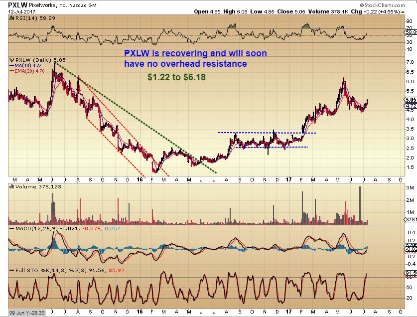 PXLW – This too is recovering after being sold off to $1.22 in 2016. It is in a bullish uptrend for longer term investors ( or traders) That wish to look into the fundamentals. ( Chris?).