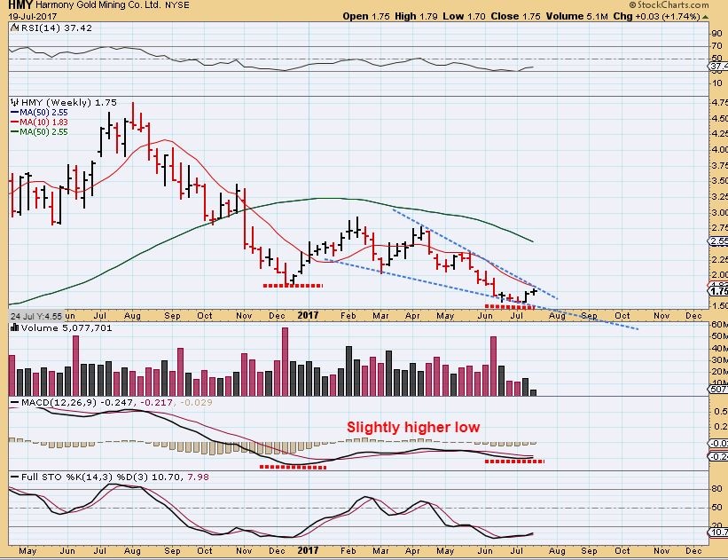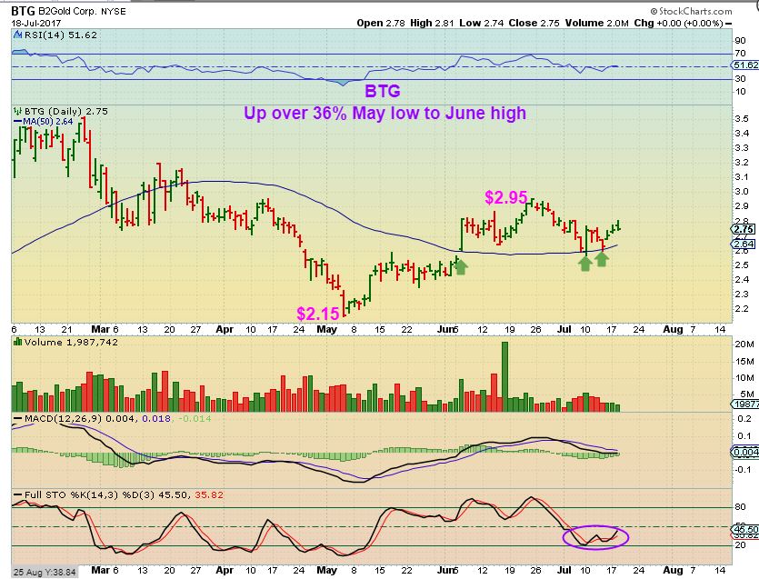 BTG –  And BTG is also up almost 40% since May.   This really seems to indicate that Miners have bottomed.   Remember when Gold sold off all through JUNE, and I was reporting that a few miners were ignoring it, even rising higher?  Look at BTG during June, and then scroll back up and look at GOLD during June.   THIS IS WHY I HAVE SAID THAT IT MIGHT BE A GOOD IDEA TO OWN SOME MINERS.  They do now seem to have bottomed. This could be bought with a stop under the 50sma , since it held on the last dip.
