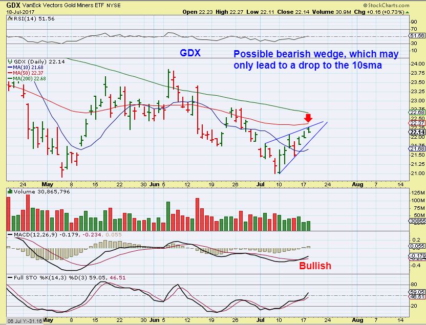 GDX–  GDX has a small rising bearish wedge forming as it nears the 50sma.  It may just pull back to the 10sma,  or if Gold surges right through its 50sma,  GDX may follow.  Everything else looks Bullish though.