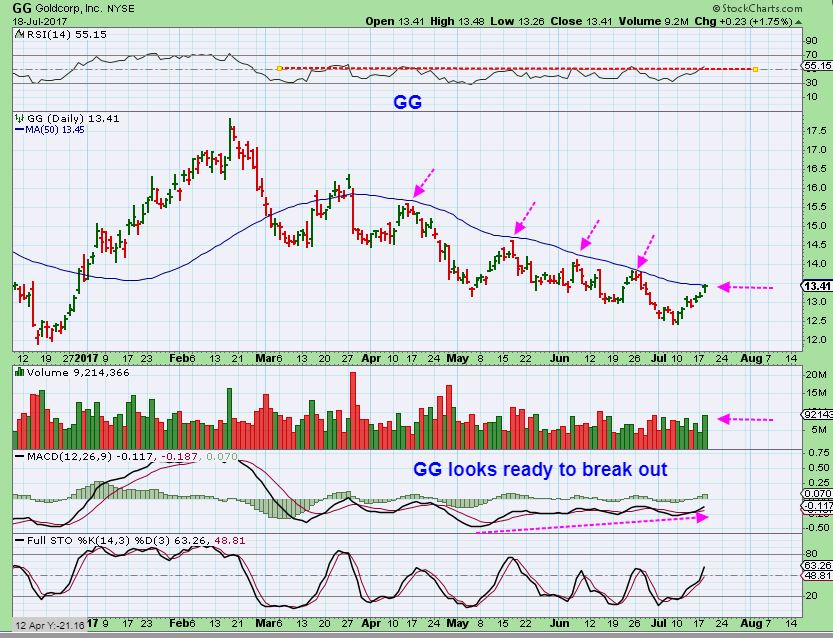 GG –  GG actually had a nice burst of volume as it pushed on the 50sma yesterday, and that can be bullish,  so Wednesday may give us more to the story.  IF GG breaks out, it is bullish and it really could run well  ( The ICL would likely be in place).   Also…