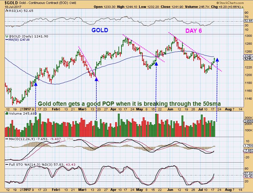 GOLD – Gold on Day 6 is approaching the 50sma too. At this point it still looks bullish and now challenges that 50sma at $1247.88.