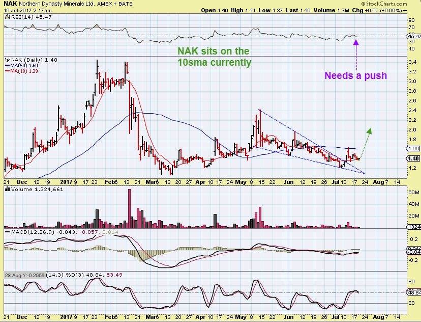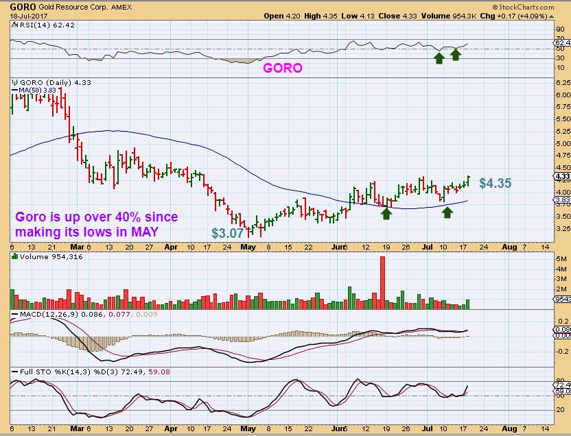 GORO –  As I have been occasionally mentioning,  GORO ( Slowly but surely) has held the 50sma break out and is actually now up over 40% since the May lows.  I actually bought this at the May lows, but cut it loose near the 50sma with the sector uncertainty.  This is 3 month highs for GORO and it looks like it is going sideways building energy for a run higher – I LIKE IT.