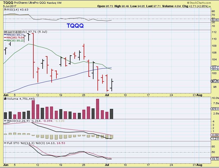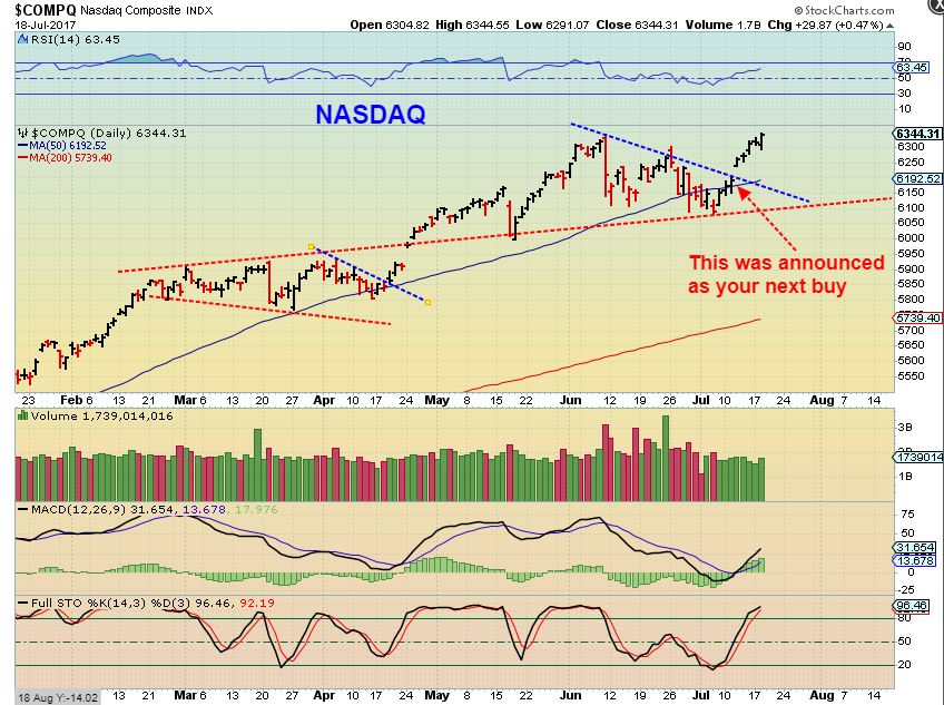 NASDAQ – Twice this year we have seen the NASDAQ go sideways and sell off for weeks giving buyers an easy opportunity to enter.  After another 2 month sideways consolidation and sell off, a buy was issued here as it recovered the 50sma.  Notice that on occasion, a Sharp 1 day drop occured out of nowhere ( We had them in March, May, & 2 in June). A back test to a trend line.  Well…