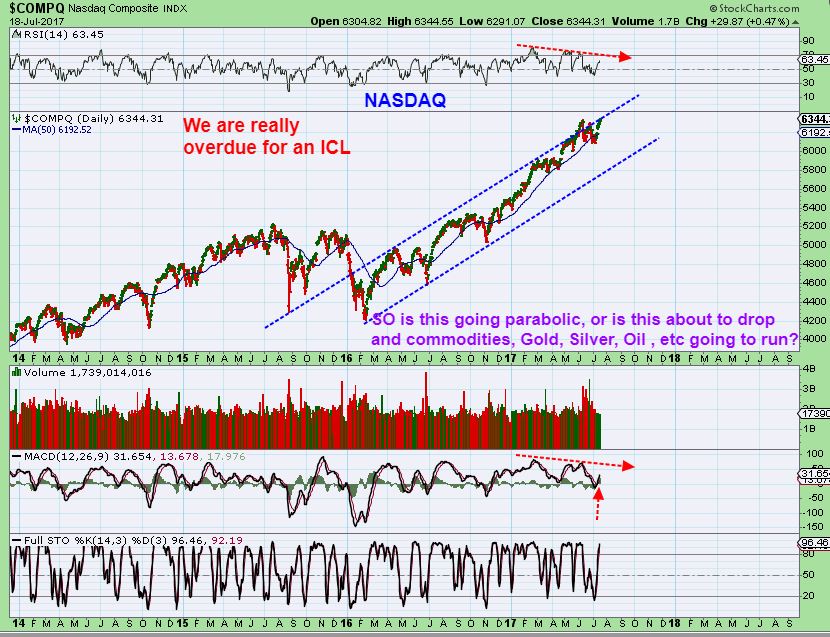 3. This sideways action could continue in a topping manner & drop into that ICL like the summer of 2016 & Nov of 2016, the last 2 really noticeable ICLs on this chart.  I’m wondering if a pause would allow the Commodities, Gold, Miners , etc to run while the general markets continue to rest.  Time will tell,  but indications of a top that I use are neutral right now after the recent sell off.