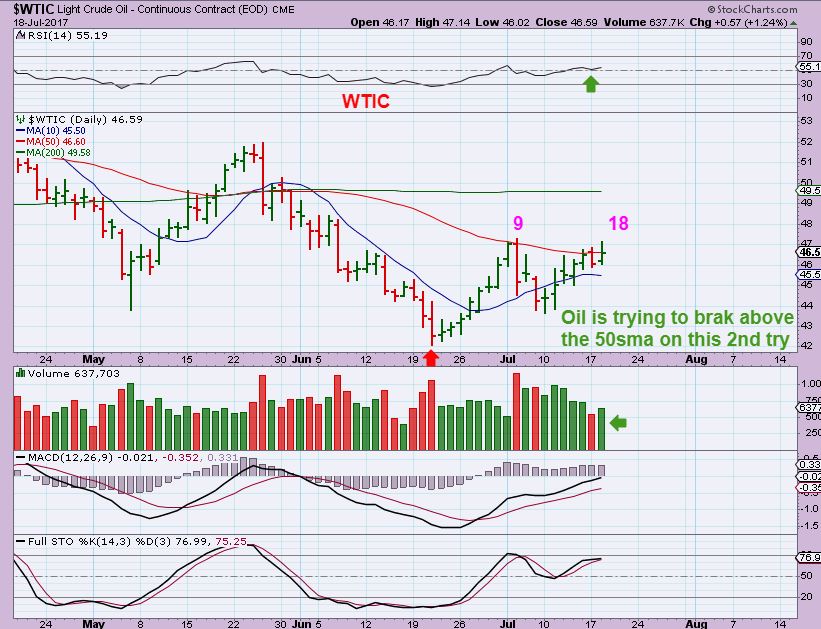 WTIC –  Oil is attempting to break out above the 50sma, and it actually still looks good.  The Oil inventory report on Wednesday may push this right through it.