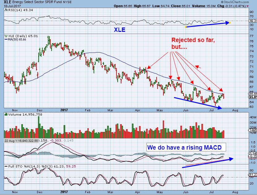 XLE –  The XLE still isn’t buying it, but look at the MACD divergence. I’ll be watching to see if the XLE can break through after a brief crawl or pause.
