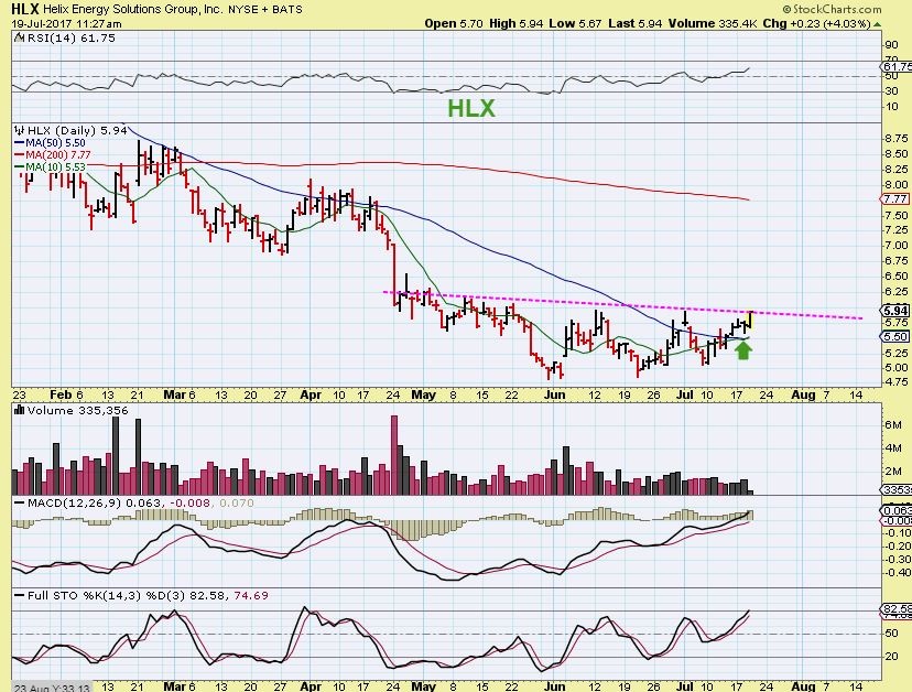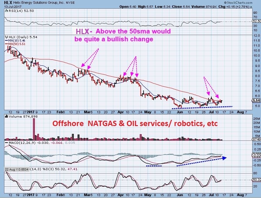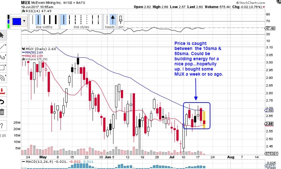 MUX –  So I look at a stock like MUX,  still trading at the recent lows. Does it have bullish signs?  Yes.  MUX broke above the blue trendline and is now pushing on the 50sma.  One could BUY it here and use a stop?  Wait to Buy a break of the 50sma, so you know that the sideways move is ending? You can decide, but I think that MUX may have bottomed LAST WEEK when I published my report on how the Miners are turning bullish.