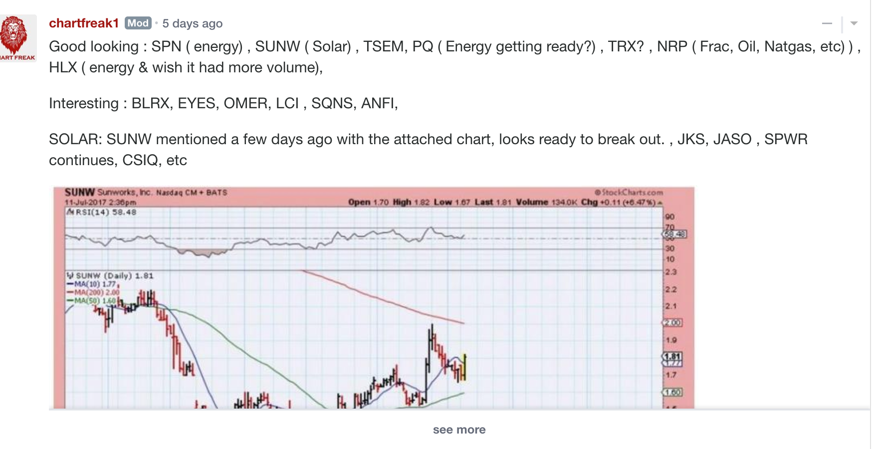 I went away at lunch time, check out HQCL, CSIQ, JKS, and I think that SUNW was rejected at the 50sma, but it will get through it soon, if volume keeps swelling on the up days.
