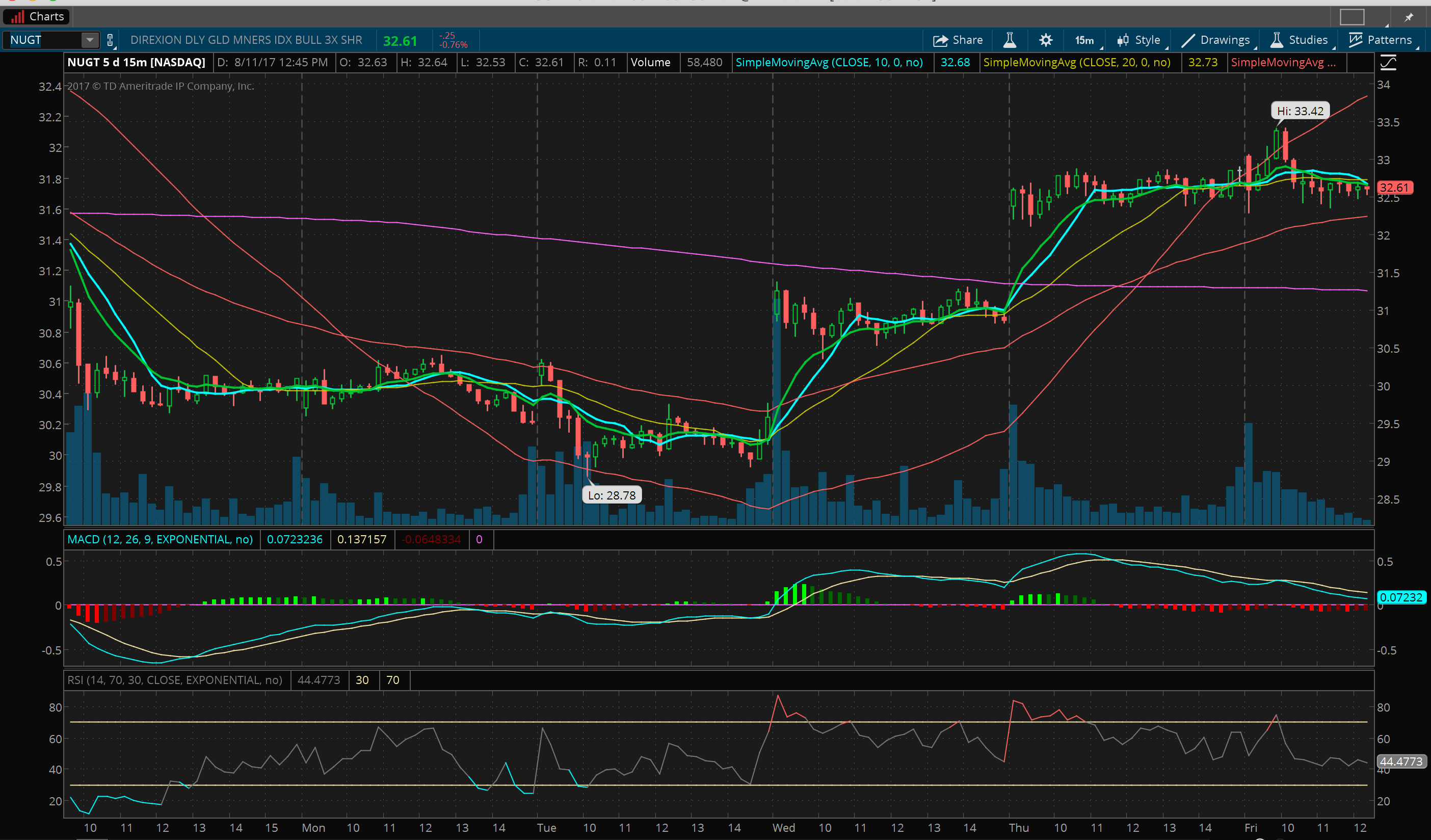 Nice going … my avg is a little higher because I’ve been adding today, but I’m very bullish on the miners right now. BTW NUGT is back to a “buy” on my 15 min chart so buying at $32.50 was a great entry.