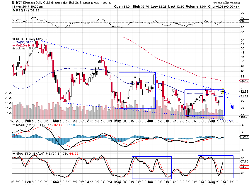 Charts look promising for GDX, etc. I am always cautious though when a technical pattern forms based on headlines and the news cycle. I tend to see those reverse often. Anyone else concerned that once N. Korea calms, gold reverses and catches all the recent converts in a false breakout? Buying DUST here.