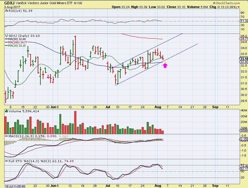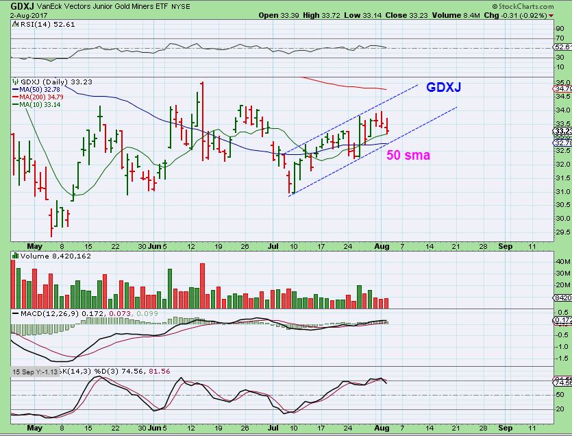 I will show you visually again why I am not being emotional about my trade, I am just letting it ride. I am just riding GDX along the 50 & 200sma, or the GDXJ above the 50sma as long as the trade remains bullishly positioned. If it stops me out, I will wait for another set up ( next dcl) . If it POPS, I capture an even better gain. Maybe the Jobs report stops me out.