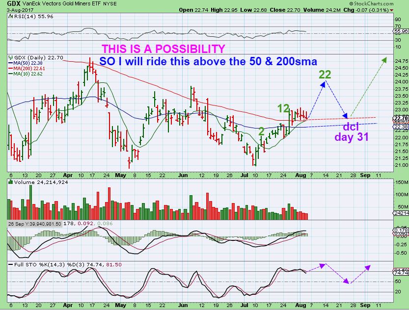 GDXJ from yesterdays report. I showed it in a channel and above the 10sma & 50sma. I am long until the 50sma is violated, because as I said, a POP could happen and you could see GDX & GDXJ run for 4 or 5 more days to day 22 or even day 25 or so, before dropping into a dcl.