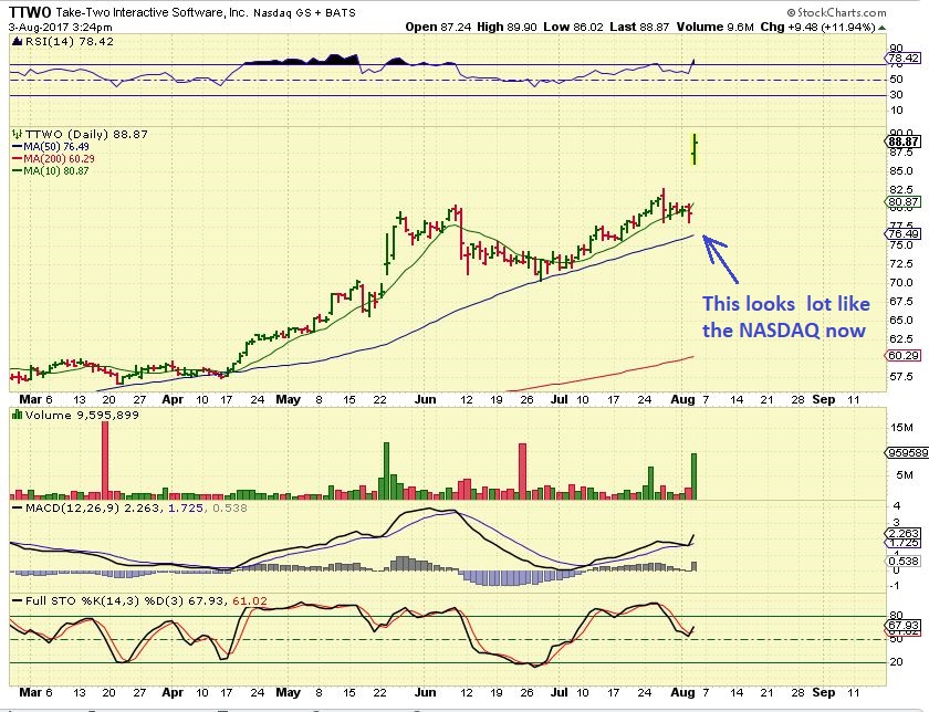On a Friday when we get the jobs reports, we often see that it can move the market in either direction. Realizing that, I then noticed TTWO after a bullish surprise yesterday and thought to myself ( see if you agree), “That TTWO set up looked just like the QQQ set up before it popped higher.”
