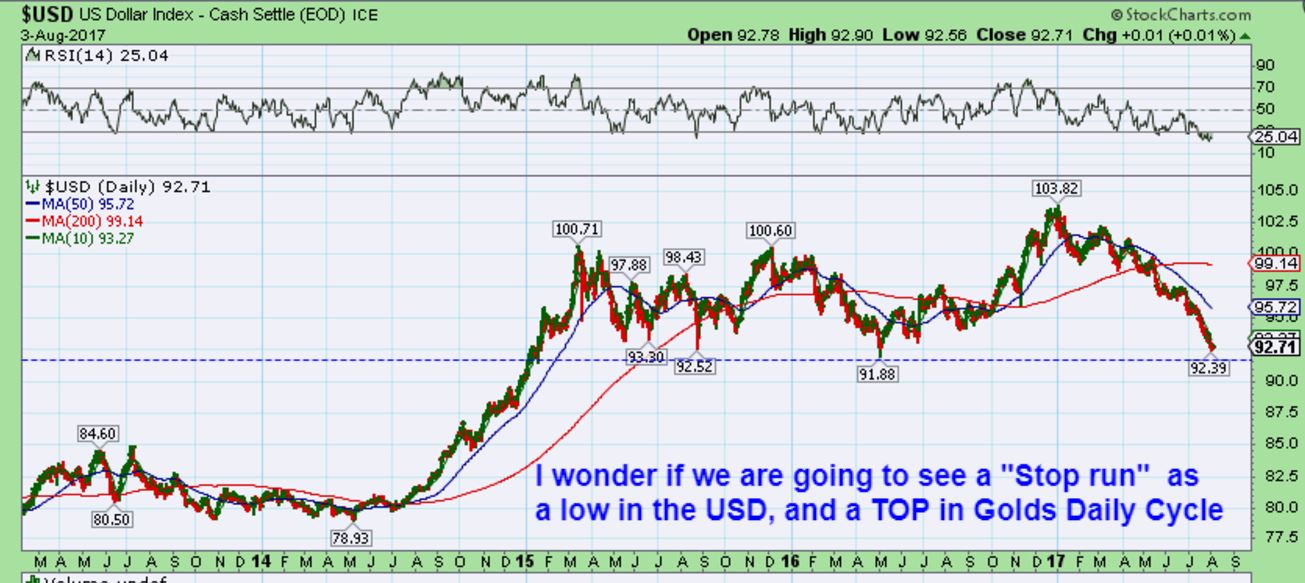 THE USD is very oversold and due for a low. I was thinking, “What if the USD did a quick stop run first, below the 91.88 of Spring 2016, and then it reversed higher? That could also see GOLD POP, PEAK, and then drop into the next dcl. ” Time will tell.