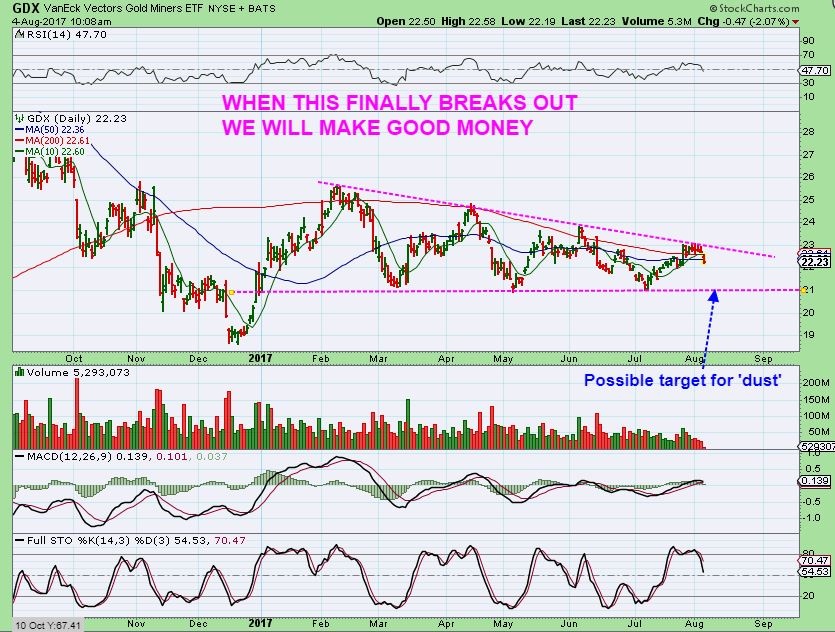 GOLD will eventually be due for a drop into a dcl, so what might it look like? Maybe it looks like this. THIS IS JUST A GUESS USING THE 200sma AS A TARGET, it could even just go sideways or bounce around the 50sma. I just see the below idea as more likely to shake out riders. The next dip is a strong buy, since Miners have been in a triangle type pattern. Let’s look at Miners.