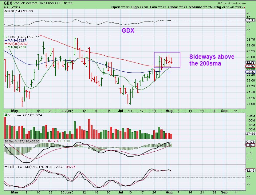 GDX – This still looks like a bullish sideways consolidation, and it is above the 200sma, the 50sma, and the 10sma, so I am not selling unless it breaks down. I did a “Lesson” on sideways consolidations yesterday, showing how they can break higher bullishly.