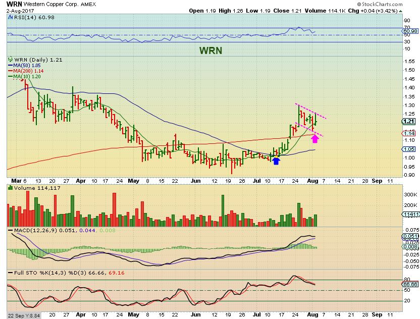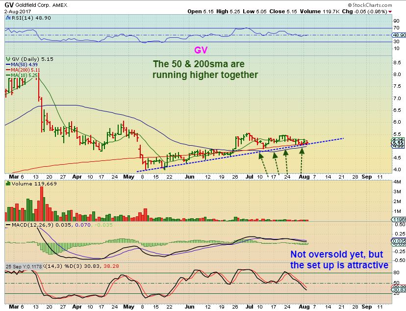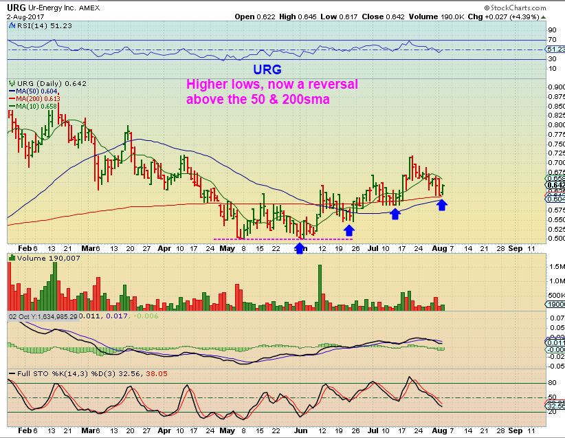 URG – With Uranium itself remaining in a Bullish consolidation, URG has also put in higher lows. Look at that 50 & 200sma. Those that are more comfortable with stocks that have rising major moving averages can consider this as a bullish set up , as long as price stays above those moving averages. This reversal on the 200sma is a low risk trade entry with a stop below the 50sma.