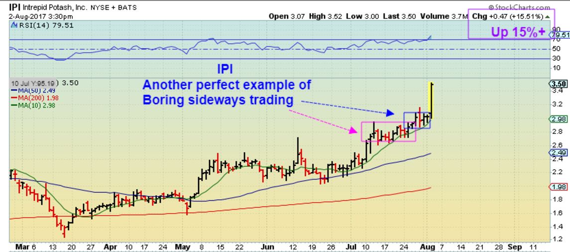 IPI – Going along with yesterdays ‘lesson’, IPI broke out from one of those “boring’ sideways consolidations and was up 17.5 % by the close.
