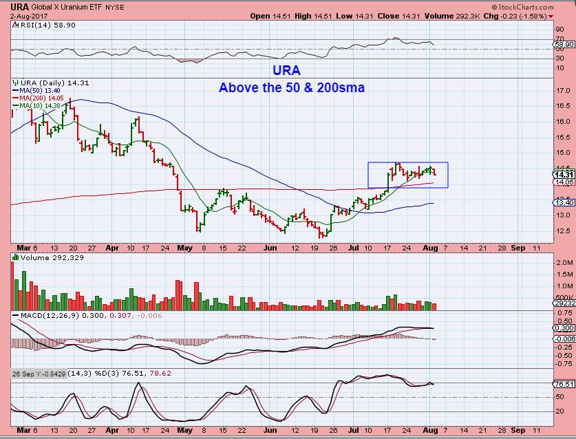 The Uranium ETF had a nice run & remains above the 50 & 200sma, now consolidating those gains. It looks bullish above the 200sma to me, and that 200sma is sloping upward. I will discuss a couple of Uranium stocks later in this report. This could drop to the 200sma.