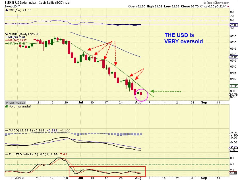 USD – The USD put in a reversal candle at the lows and is EXTREMELY Oversold. If the USD moved above the 10sma and ran to the 50sma, I would expect Gold to drop, but honestly, Gold doesn’t look like it wants to drop yet. I am watching the USD daily.